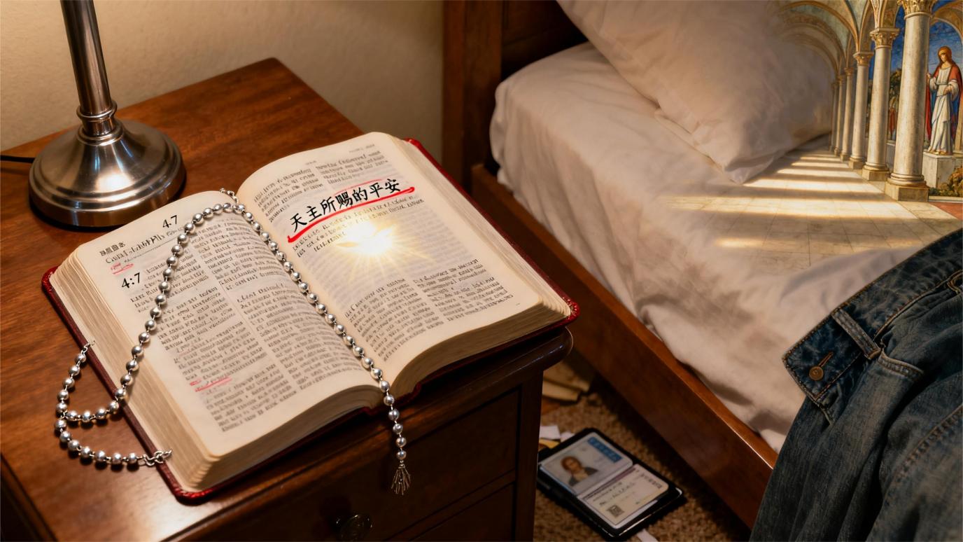 出发前一晚,哄睡大宝后,我坐在床边整理第二天要带的证件,心里却突然响起一句话:“天主会赐给你出人意外的平安。”一开始我以为是自己太在意路途,毕竟要带着老人和婴儿开几个小时车,可这句话像有分量似的,一遍遍在心里清晰浮现,前前后后竟有十几次。我拿起床头的圣经,随意翻开一页,竟是《斐理伯书》那页“天主所赐的平安,超乎各种意想”这句话,我轻声祈祷:“主啊,求你保守我们一路顺利,让我们平平安安见到老公。”
