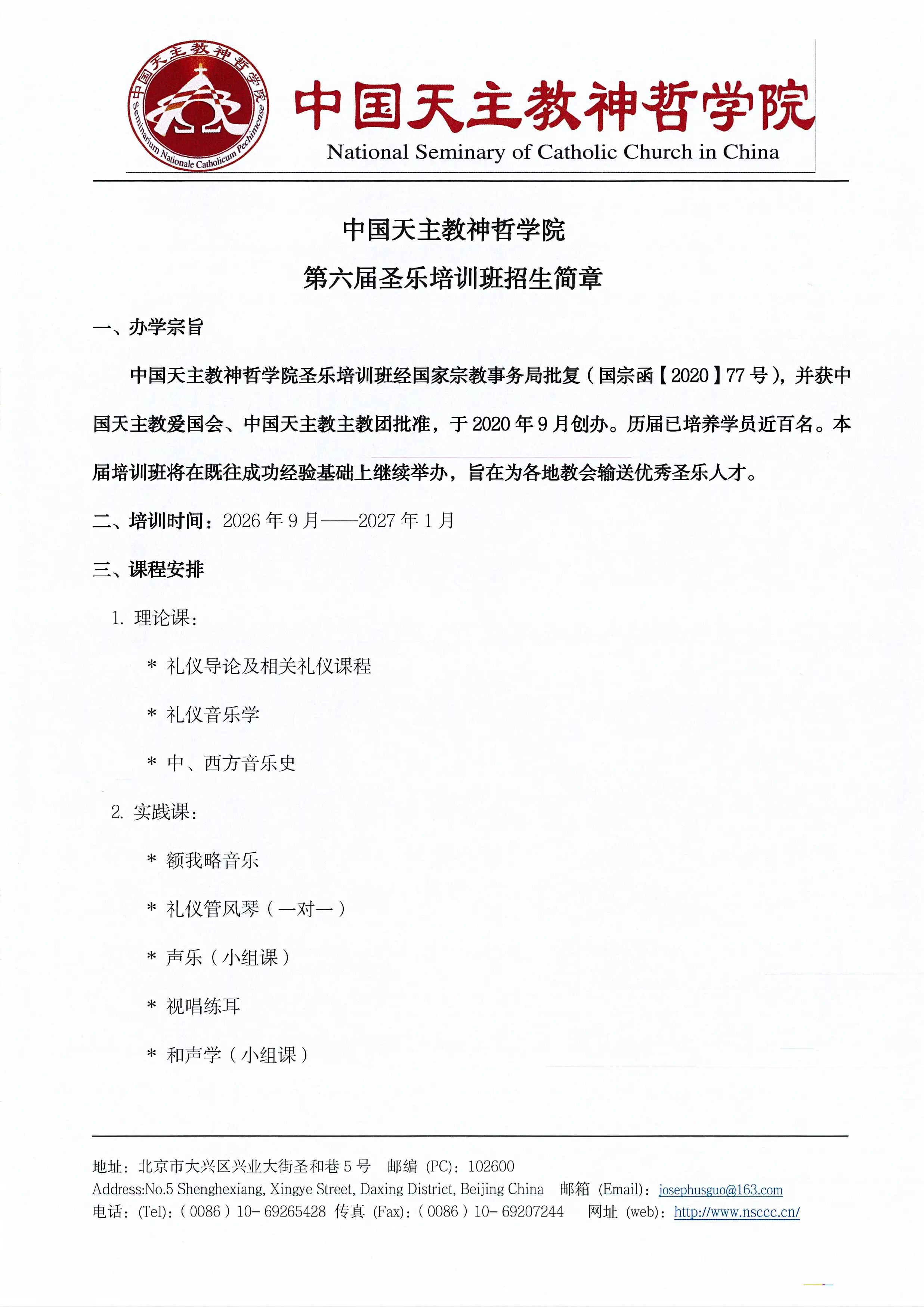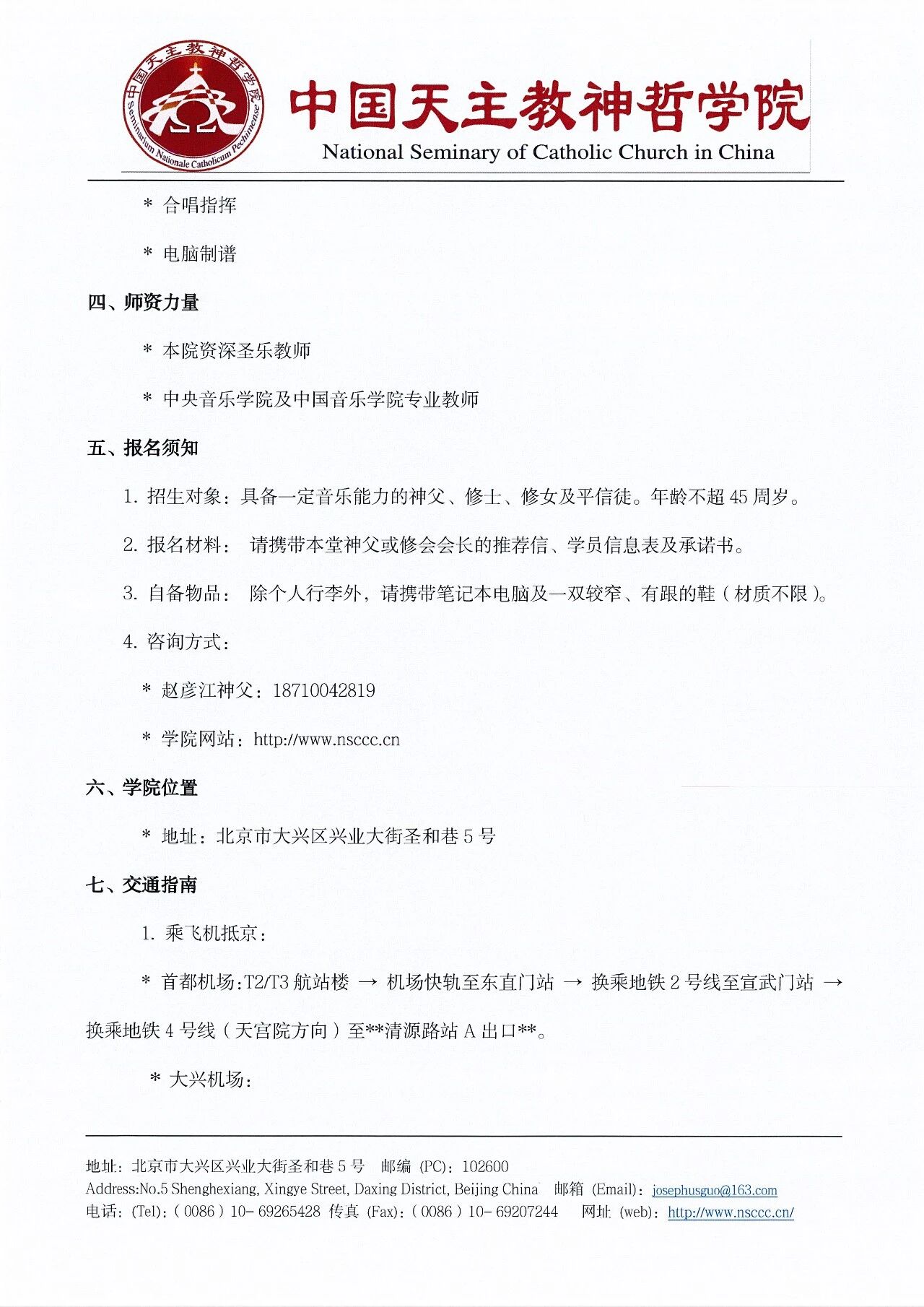1. 招生对象:具备一定音乐能力的神父、修士、修女及平信徒。年龄不超45周岁。